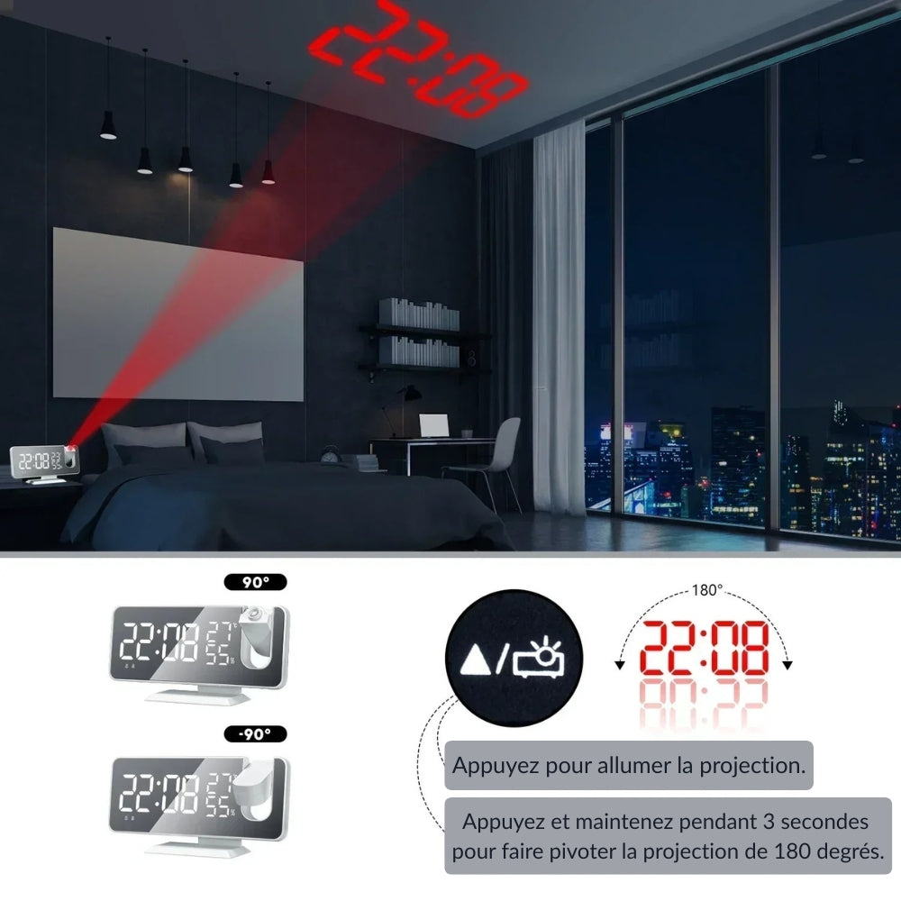 • Projection rouge haute définition, rotative à 180°, visible jusqu’à 5 mètres pour une lecture facile de l’heure au plafond ou sur un mur