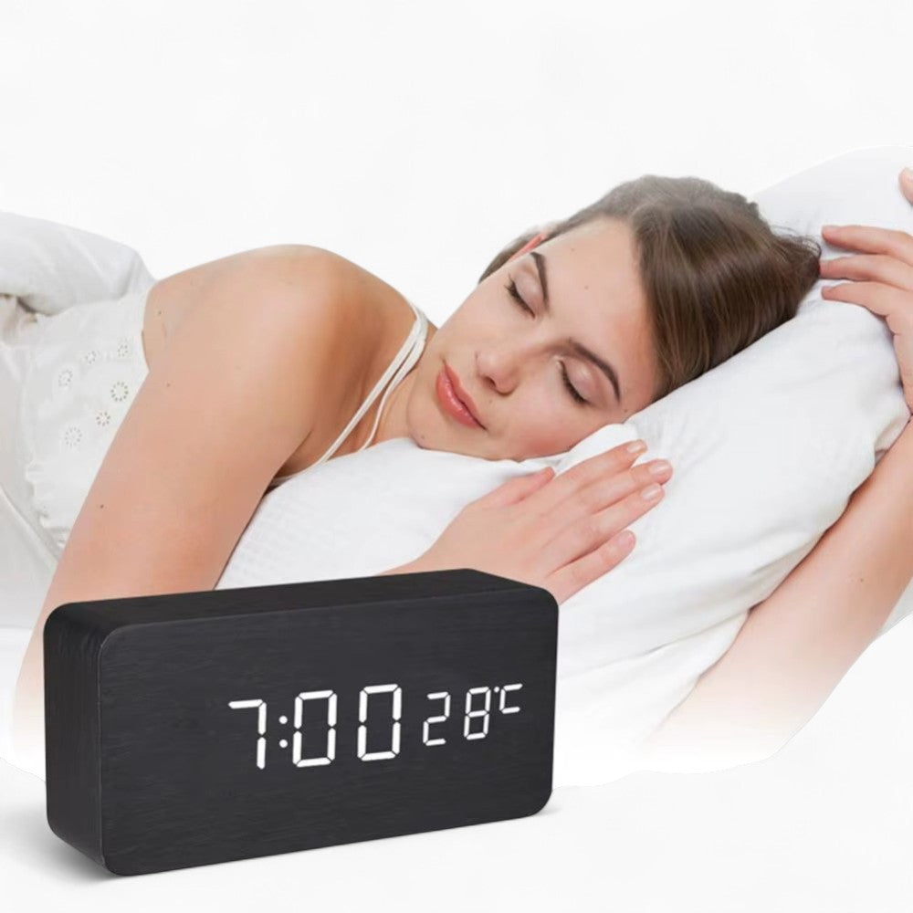 Son affichage LED clair et son design en bois naturel apportent une touche de raffinement tout en offrant une lecture facile de l’heure et de la température.