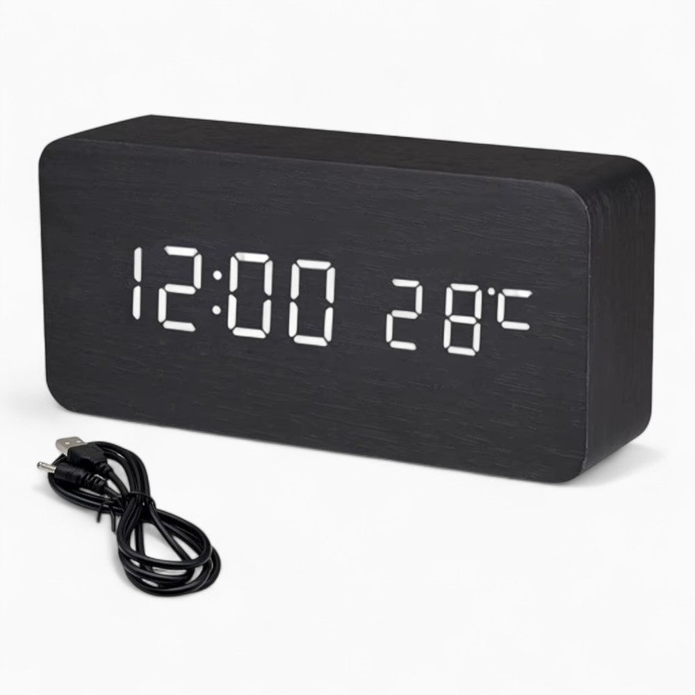 Ce réveil au design élégant en bois foncé vous assure un réveil doux et pratique avec son affichage LED clair et multifonction, parfait pour toutes les chambres modernes.