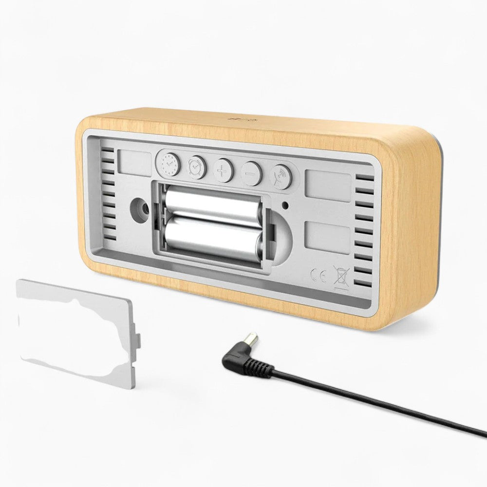 Ce réveil pratique avec batteries et alimentation secteur facilite son utilisation, offrant une gestion simple de l'heure et des paramètres avec un design épuré.