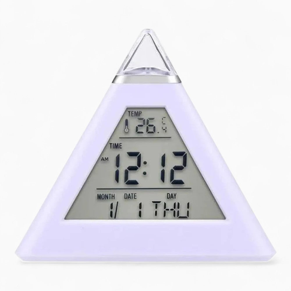 Ce réveil pyramidal offre un affichage clair de l'heure et de la température, avec un design élégant et moderne.